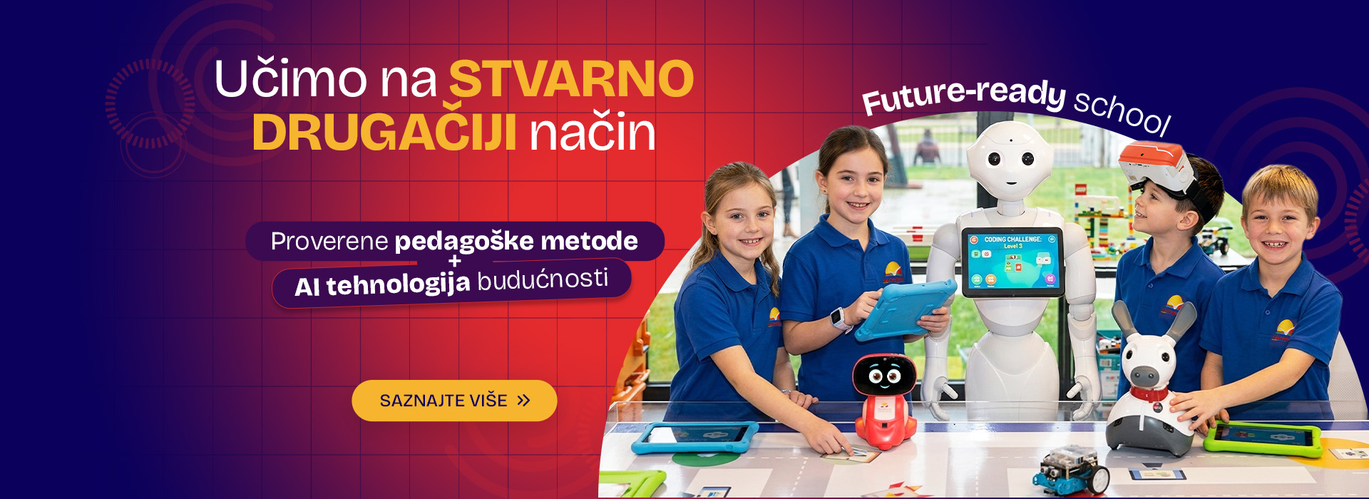 Oslanjajući se na savremene svetske metodičke trendove i tehnologiju prilagođenu školarcima, stvorili smo sigurnu sredinu u kojoj se vaše dete razvija slobodno i u koju dolazi sa osmehom.