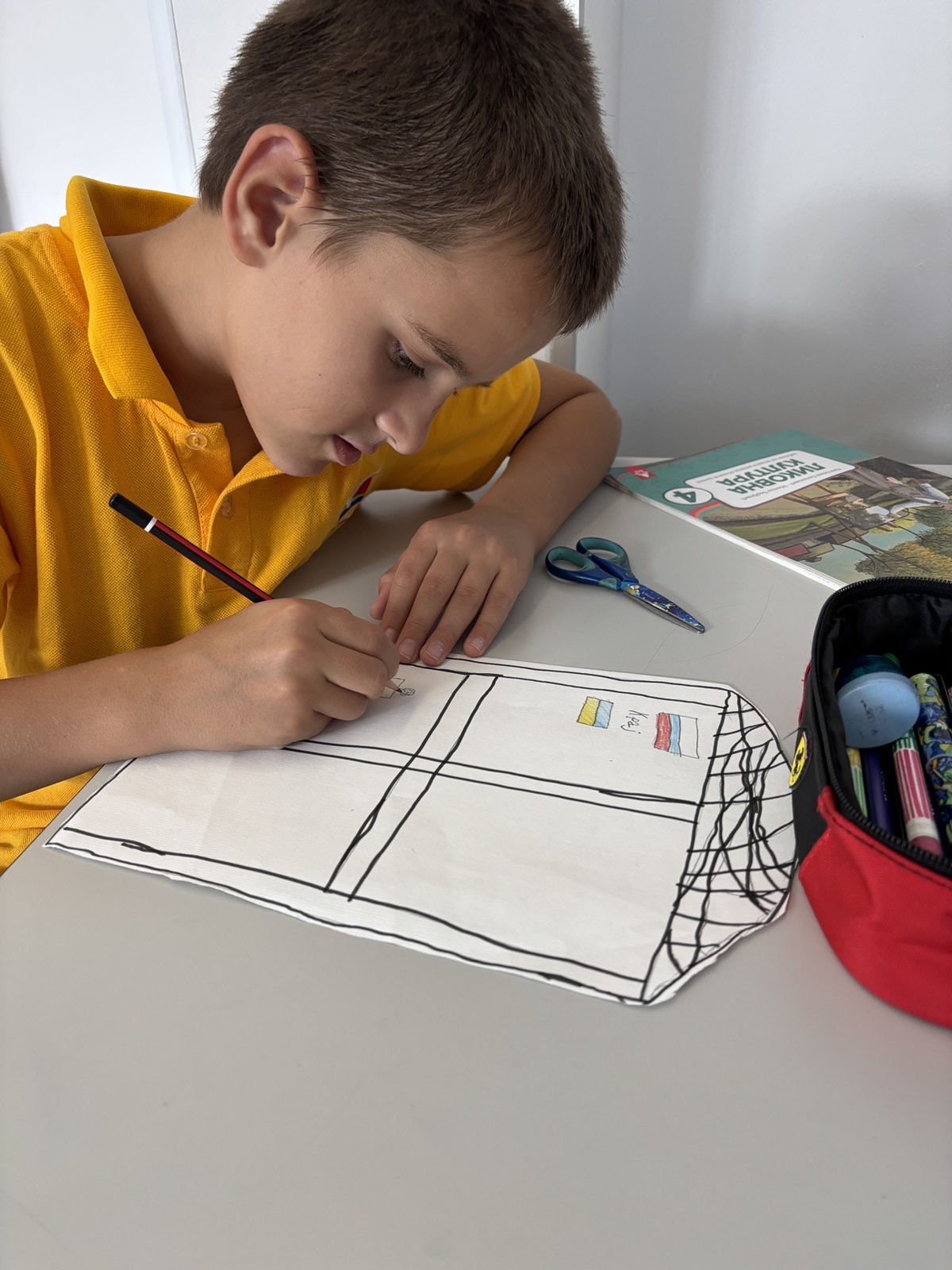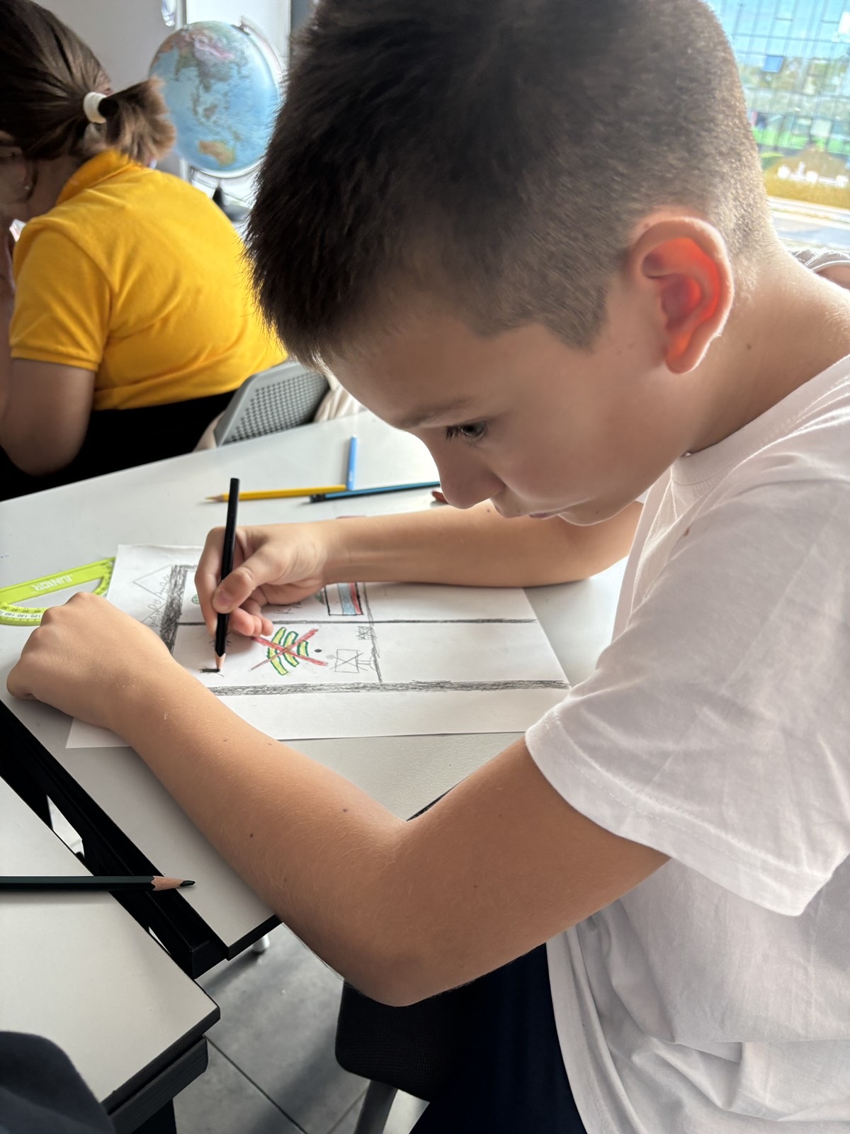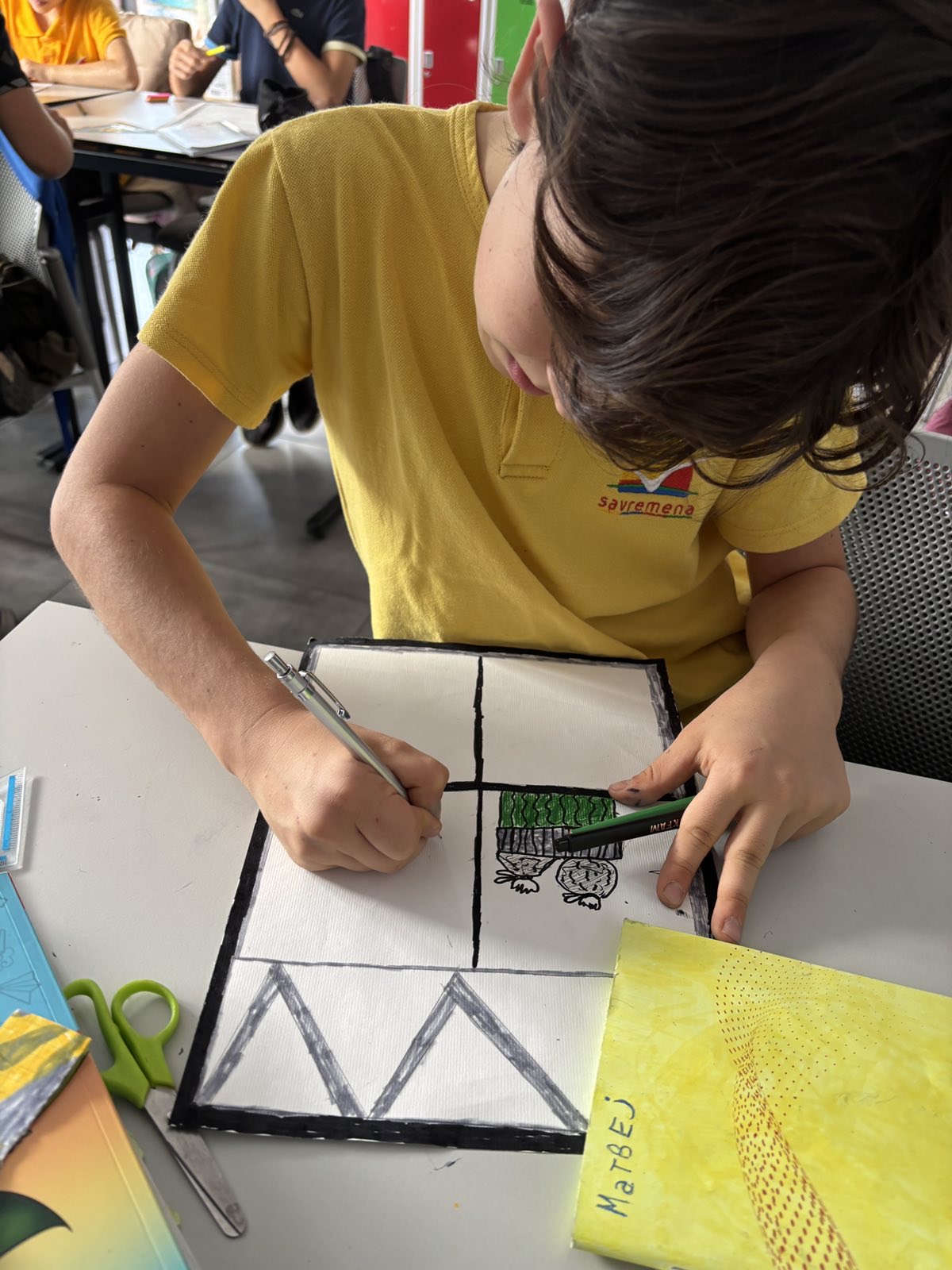 Učenici su najpre osmišljavali okvir svog prozora, a zatim su unutar njega, u poljima koja ga dele, crtali scene koje odražavaju njihovu viziju boljeg sveta. 💛 Neki su zamišljali svet bez zagađenja, neki okružen ljubaznošću i podrškom, dok su drugi prikazali mesta bez nasilja i mržnje, puna igre, radosti i prirode. Na taj način svako dete postalo je mali stvaralac koji svojim pogledom gradi lepšu budućnost.