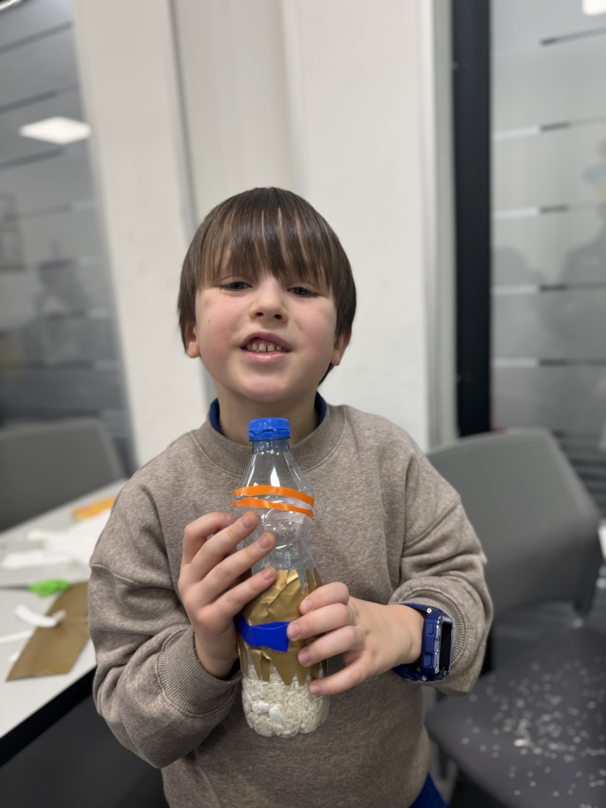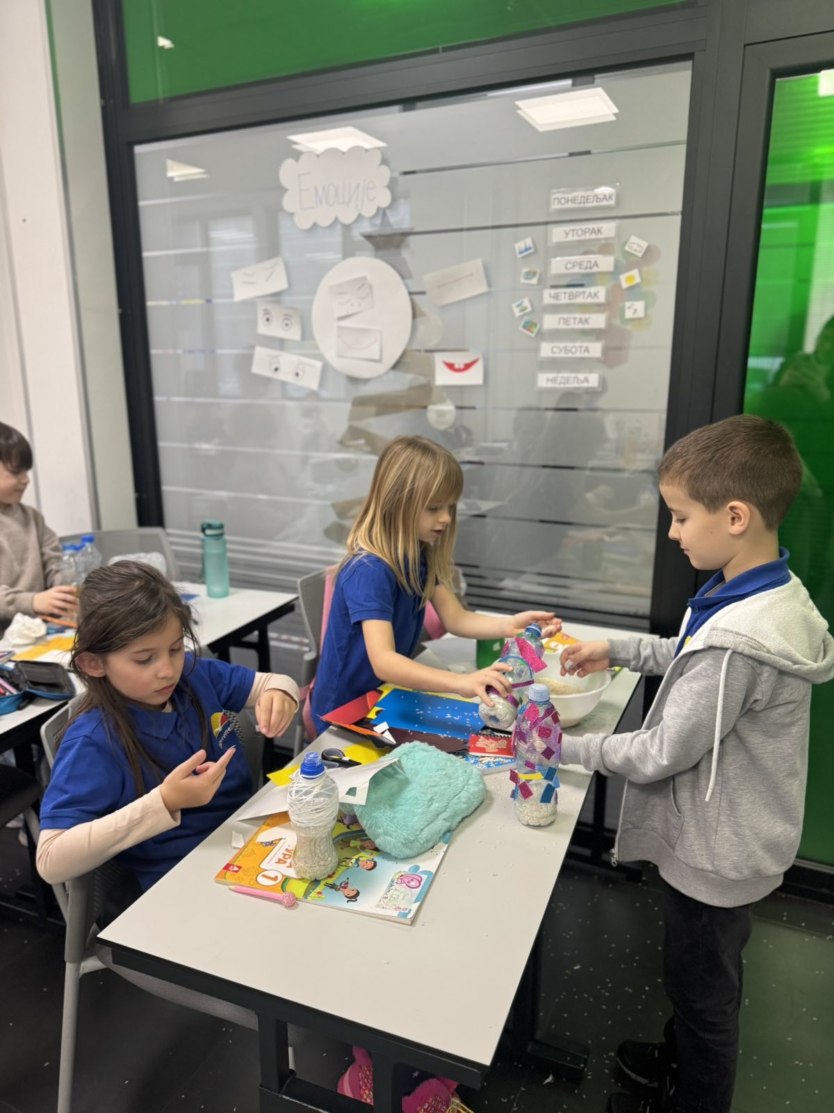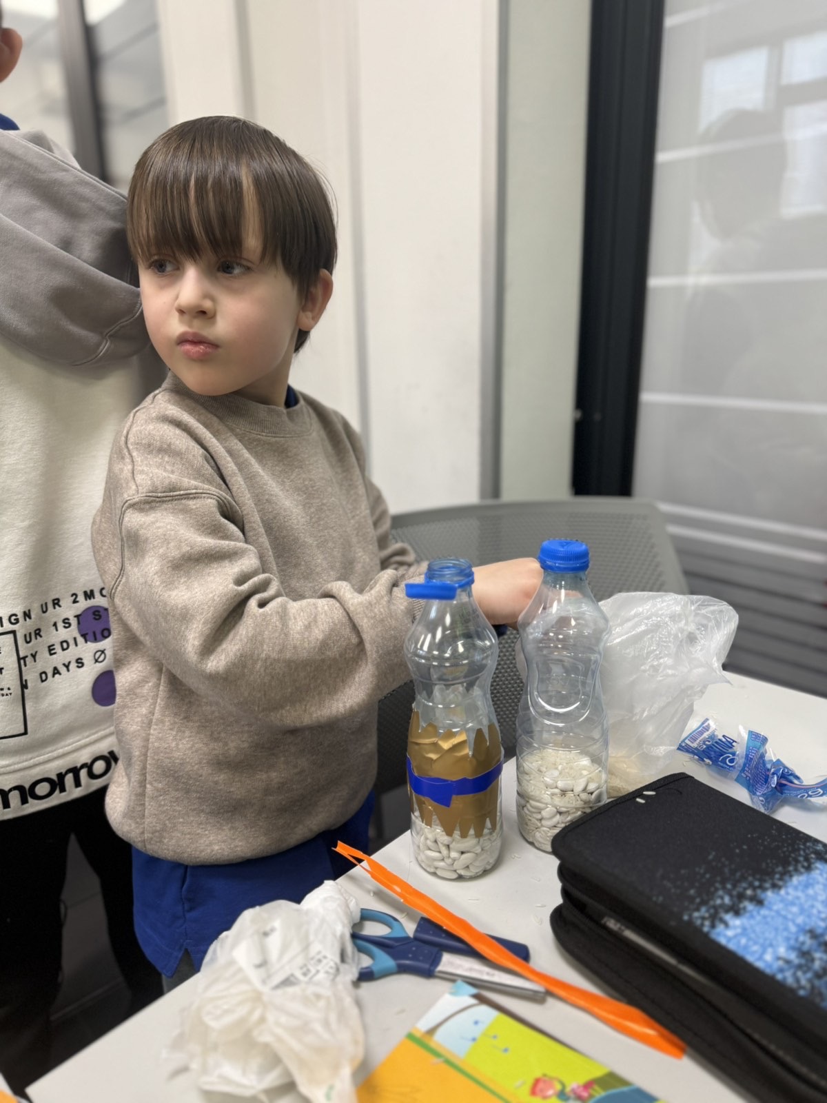 Atmosfera u učionici bila je puna uzbuđenja dok su mališani biralI šta će staviti u svoje flaše – pasulj, pirinač, šargarepu ili možda kombinaciju svega. Svaki materijal davao je drugačiji zvuk, a deca su to brzo primetila. Neko je želeo dubok, prigušen zvuk pa je izabralo krupnije zrnevlje, dok su drugi voleli oštar, zvonki zvuk sitnijeg pirinča. Svaka zvečka bila je jedinstvena, baš kao i dete koje ju je napravilo. Učenici su razumeli da muzika nije samo ono što čujemo na radiju – muzika je svuda oko nas, samo treba znati kako da je prepoznamo i stvorimo.
