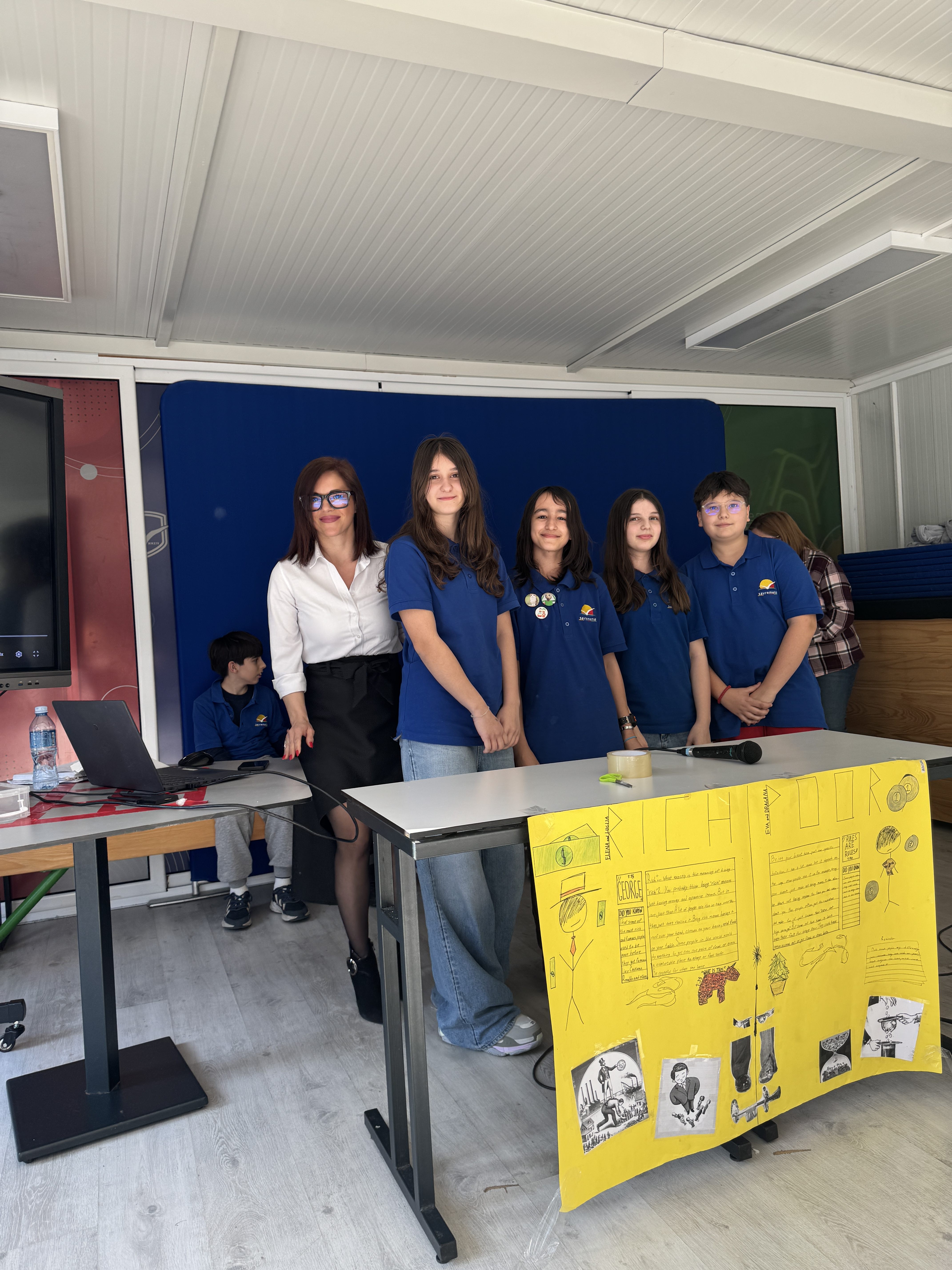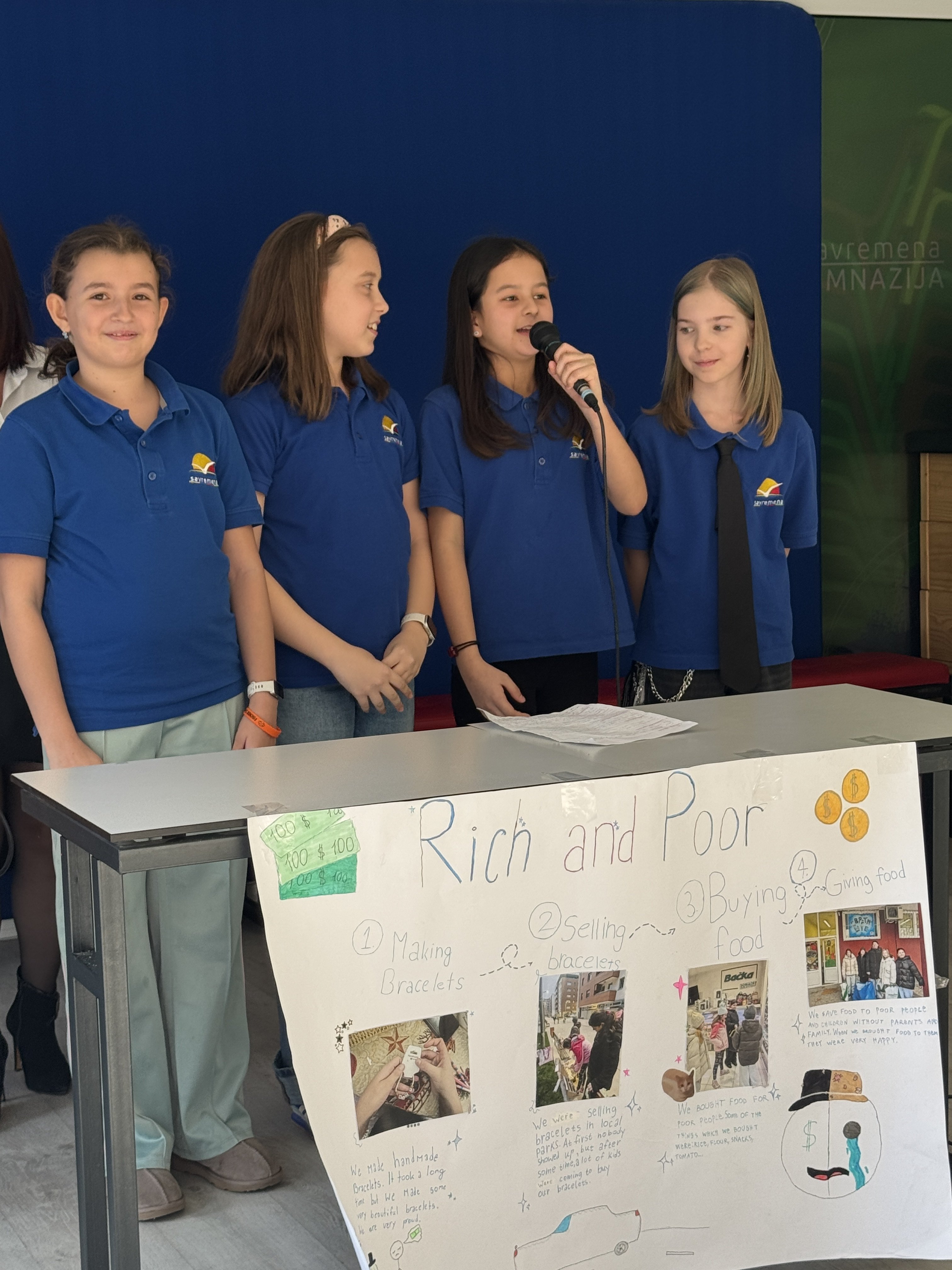 Timovi Rich and Poor (Eva, Elena, Lucija, Dragana i drugi) bavili su se socijalnom pravdom – kako društvo tretira bogate i siromašne, da li je to pravedno, šta znači biti bogat. Jedan tim napravio je video koji pokazuje kako se prema ljudima postupa različito samo zato što imaju ili nemaju novca. Drugi tim prodavao je narukvice, sakupio novac, kupio hranu i vodu, ukrasi kese, dodao i novac – i podelio sve ljudima kojima je to zaista trebalo. I zaključili: “Sreća nije u novcu, već u srcu. To bi trebalo da bude lekcija za sve.”