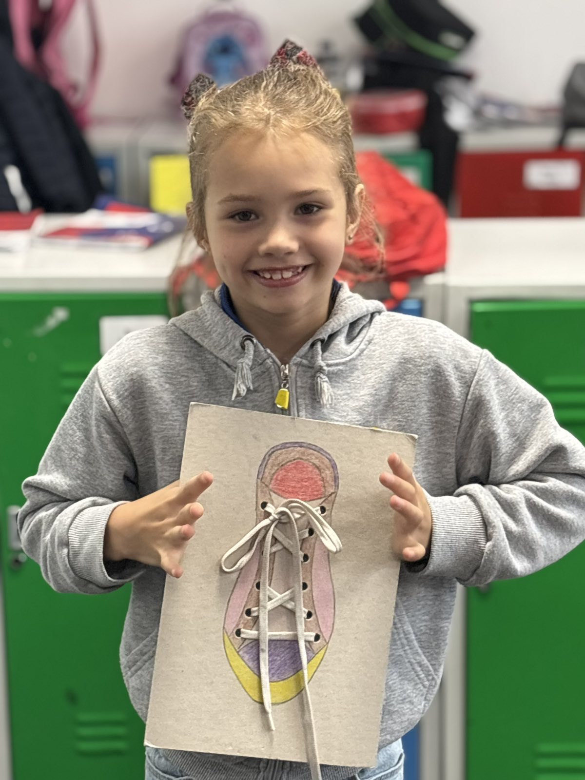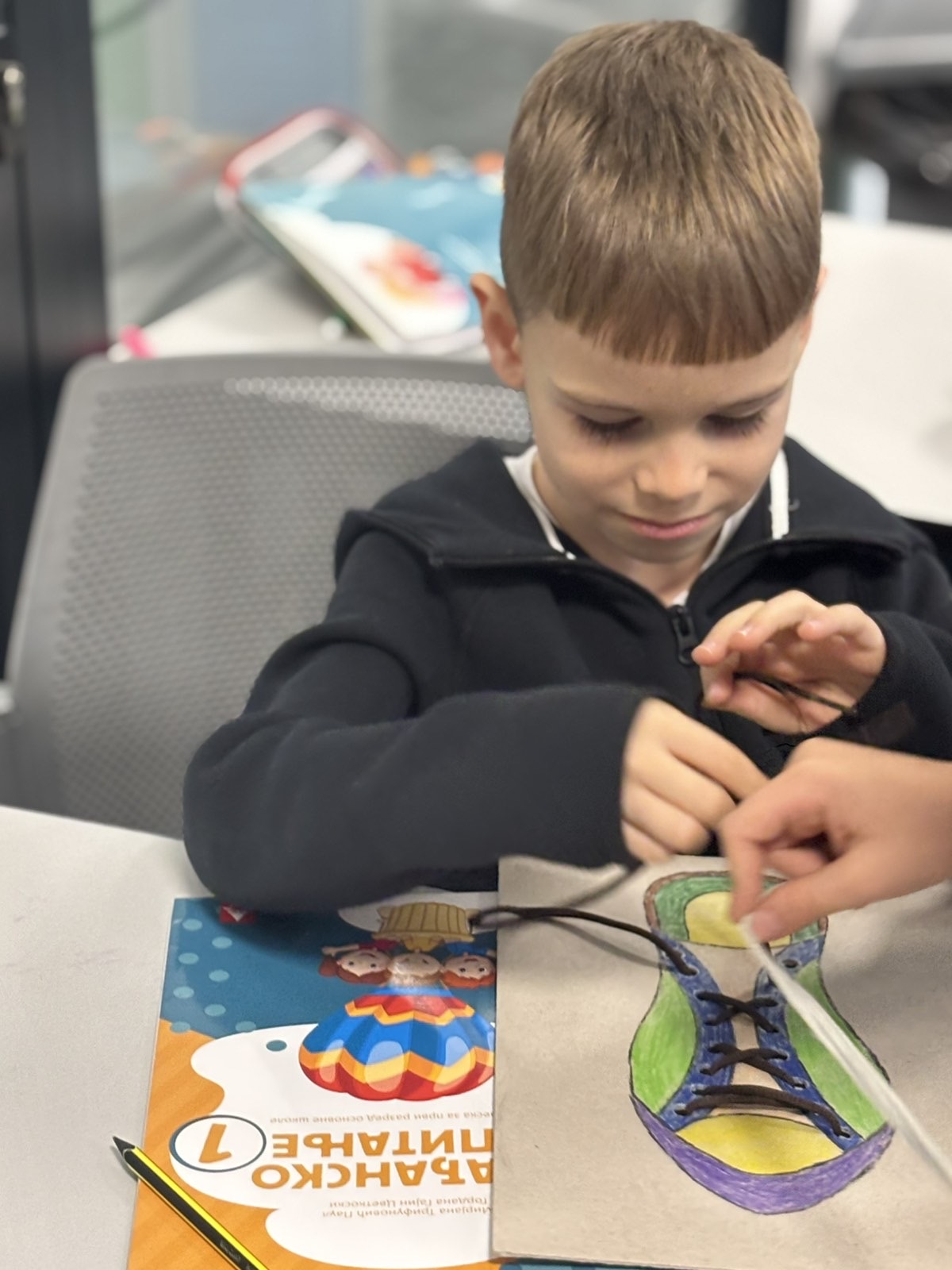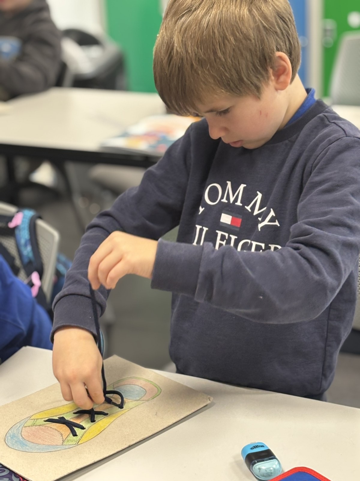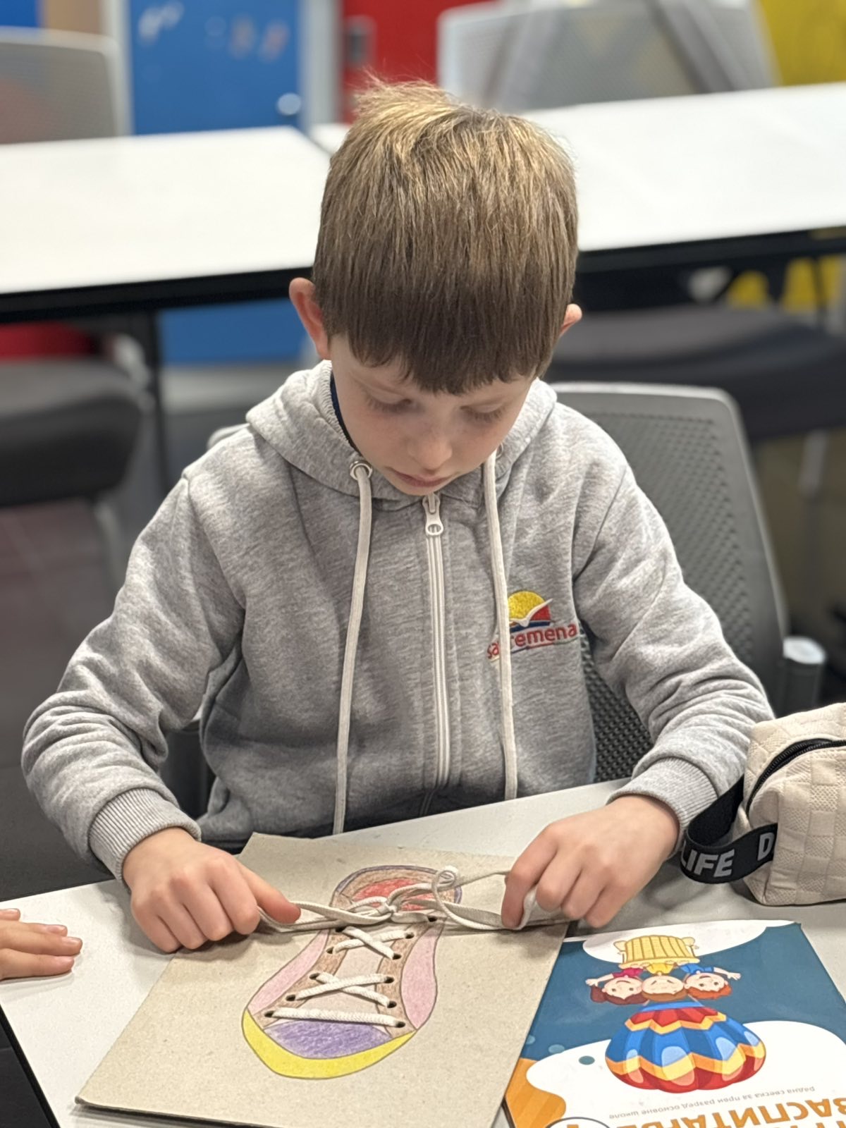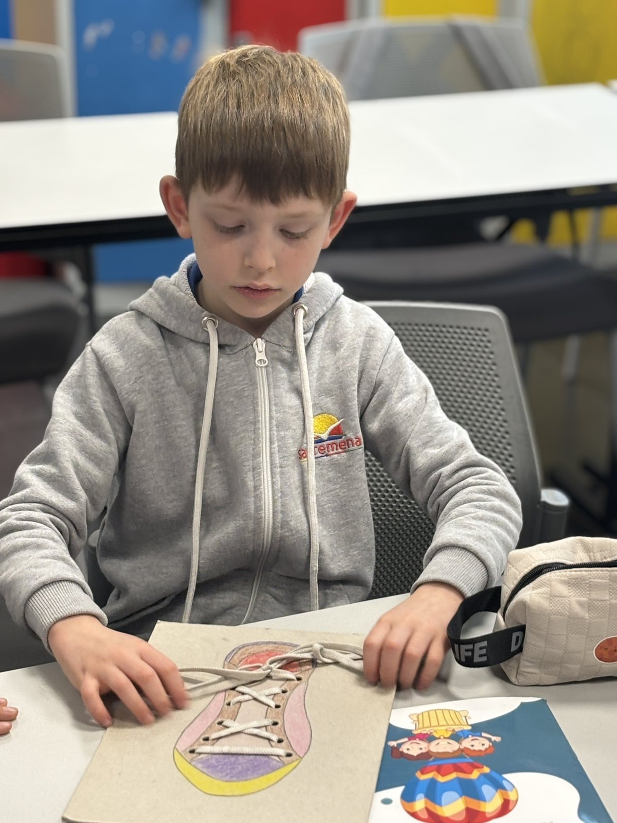 Iako naizgled jednostavno, vezivanje pertli je veština koja kod dece razvija izuzetno važne sposobnosti — finu motoriku, koordinaciju pokreta, vizuelnu pažnju, strpljenje i samopouzdanje. Upravo zato je ovaj čas bio organizovan tako da svaki učenik dobije svoj personalizovani „model patike“, oslikan bojicama, sa pravim pertlama provučenim kroz kartonske rupice.