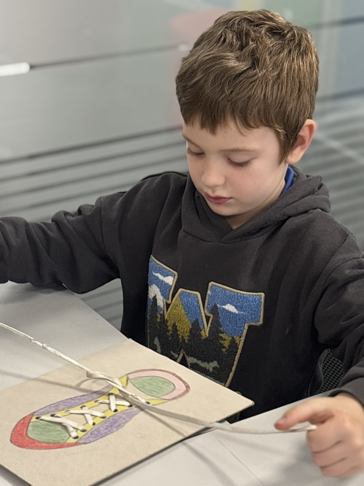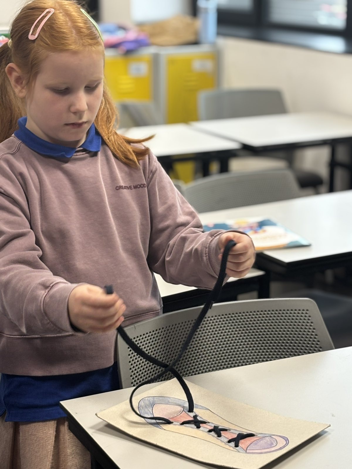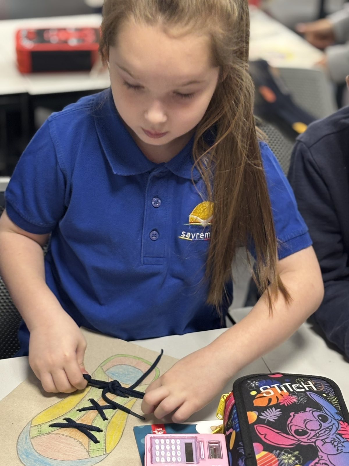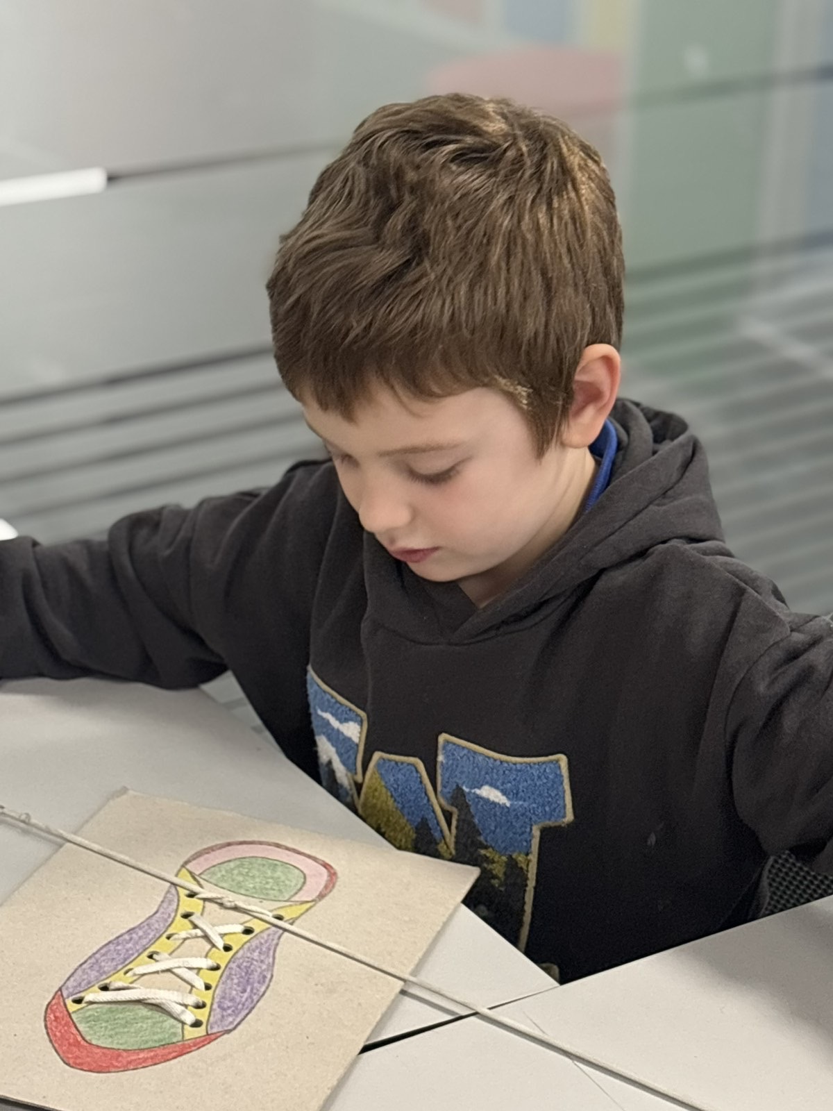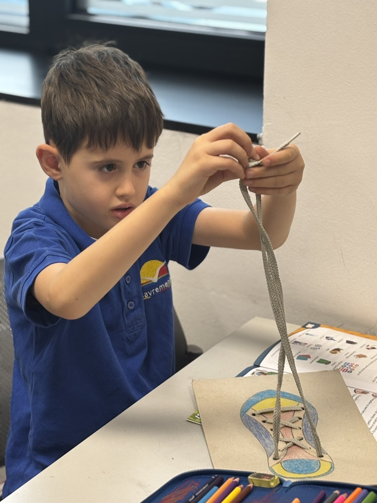 Iako naizgled jednostavno, vezivanje pertli je veština koja kod dece razvija izuzetno važne sposobnosti — finu motoriku, koordinaciju pokreta, vizuelnu pažnju, strpljenje i samopouzdanje. Upravo zato je ovaj čas bio organizovan tako da svaki učenik dobije svoj personalizovani „model patike“, oslikan bojicama, sa pravim pertlama provučenim kroz kartonske rupice.