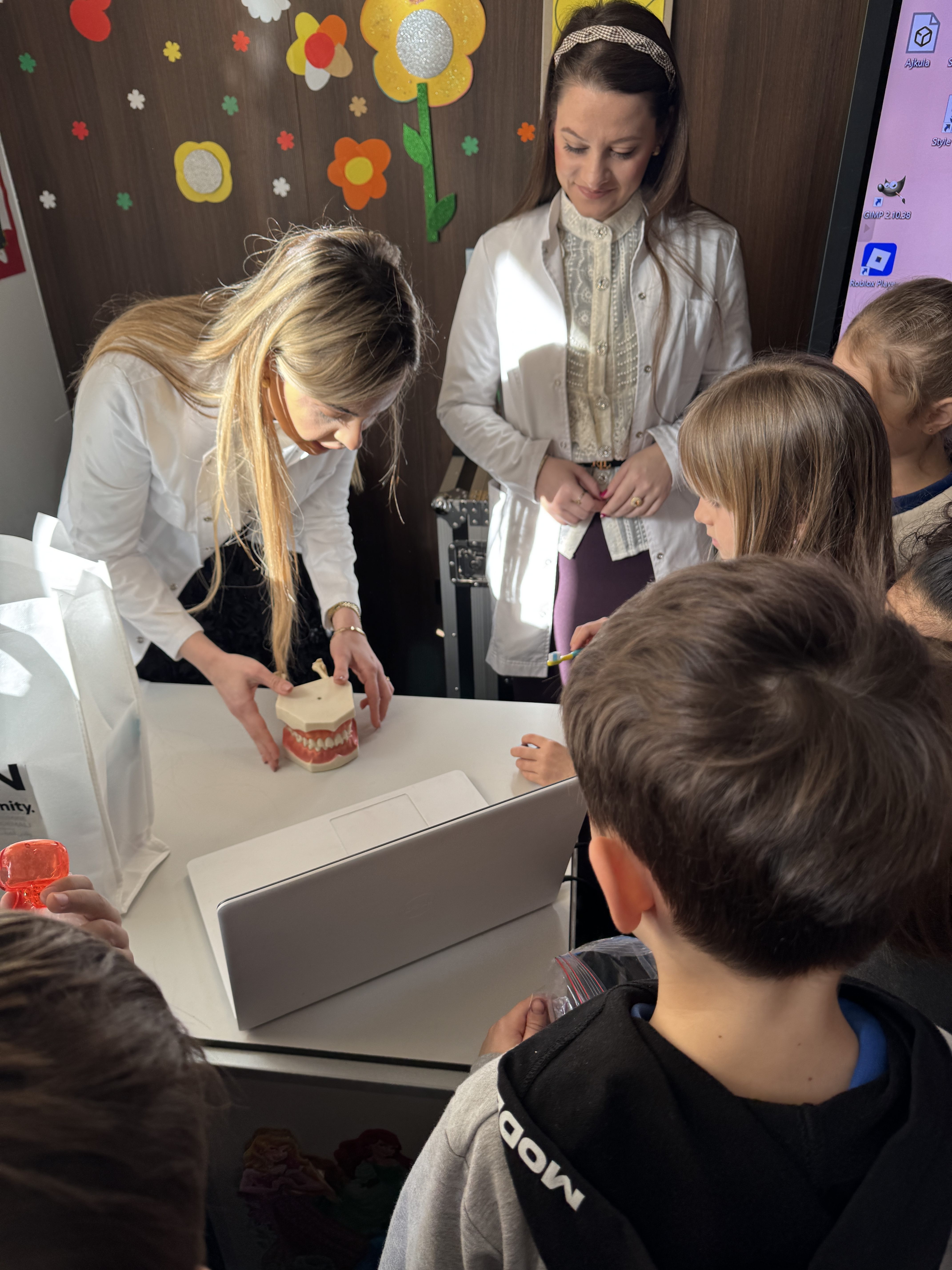 Ali radionica nije bila samo teorija. Andrijana je pokazala pravilnu tehniku pranja zuba – kako držati četkicu, pod kojim uglom, koliko dugo prati, koji pokreti su ispravni. Koristila je model vilice da pokaže kako četkica treba da ide po svim stranama zuba, kako da se ne preskače nijedan deo, i zašto je važno prati i one zadnje zube koje ne vidimo lako.