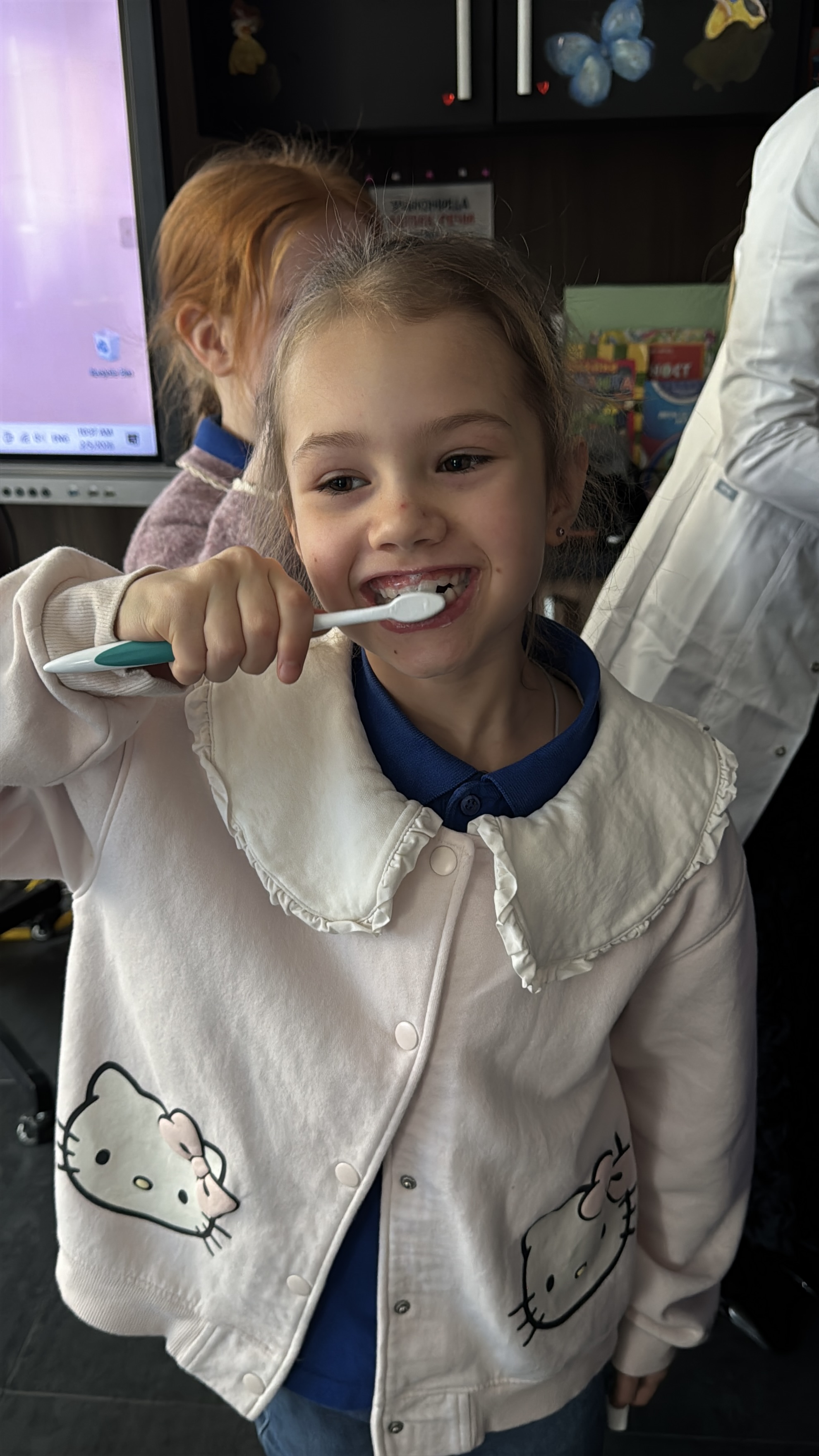 A onda je došao poseban deo – deca su donela svoje četkice od kuće. Andrijana ih je pregledala, proveravala da li je četkicama vreme za zamenu, objasnila kako prepoznati kada je četkica istrošena i zašto je važno redovno je menjati. Svaki učenik dobio je povratnu informaciju o svojoj četkici, naučio kada treba da zamoli roditelje za novu, i razumeo da briga o zubima počinje sa osnovnim alatom – ispravnom četkicom.