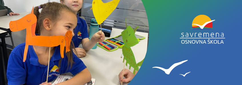Za razliku od klasičnih dramskih priprema, naši mali glumci kreću od samog početka — stvarajući likove koje će igrati. Uz makaze, karton, bojice i puno mašte, nastala je šarena galerija životinja: žirafe, mačke, ptice, konji, zmajevi i potpuno izmišljena bića čiji se karakter vidi već na prvi pogled. Deca su birala boje, crtala oči, dodavala detalje, osmišljavala imena i osobine, objašnjavajući ponosno: „Ovo je moj lik i on ima posebnu supermoć!“