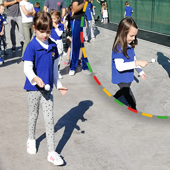 Na prostranom školskom dvorištu, plavi, zeleni, crveni i žuti tim su zaigrali dobro poznate sportske igre, a onda su iskoristili pingpong lopticu za vežbanje ravnoteže i brzine. Trkali su se prenoseći lopticu u kašičici od jednog kraja terena do drugog, a svoju izrazitu spretnost dokazali su time što im nijedna loptica nije ispala. Sa kašičice loptica je završila na stolu za stoni tenis, čija su pravila učenici lako savladali, a svoje oduševljenje i ovom igrom podelili su sa roditeljima: